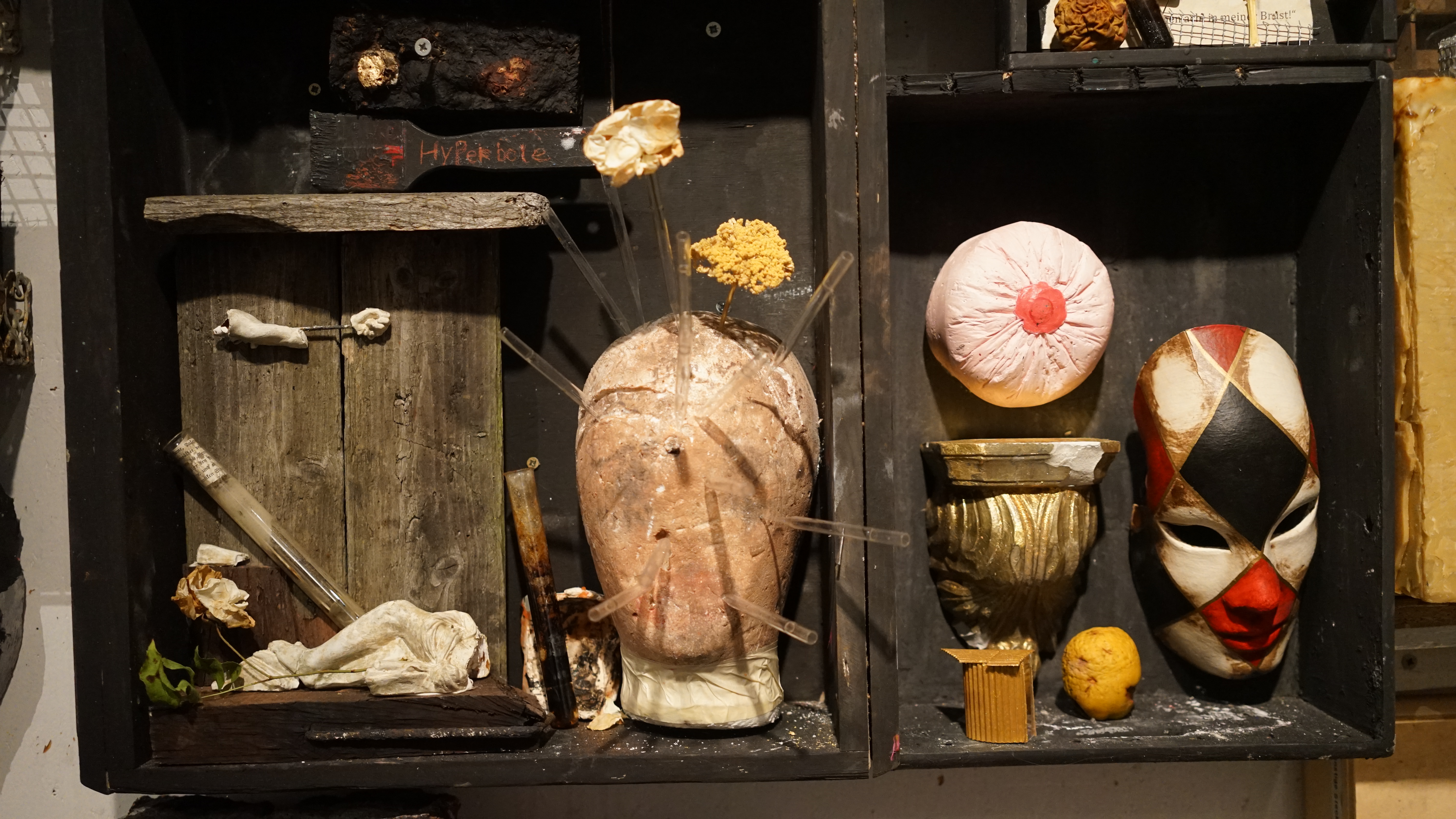 Ausgehend von Relikten, welche in den letzten Jahren aus der Praxis des Kunstunterrichtes liegen geblieben sind, habe ich in der Adventszeit 2021 für die Schüler der Oberstufe vesucht solche “Objekt Trouvets” im Atelier zu einer Assemblage oder Installation zu fügen. Ist nicht jeder Raum in dem Pädagogik stattfindet eine Wunderkammer? Hier ein paar aktuelle Fotos, die das Konzept Wunderkammer als “sicheren Ort”, aber auch irritierenden Ort der Kunst inszenieren. Geplant sind, wie oben durch erste Glaselemente angedeutet, farbige Glasfenster im Jahr 2022 einzufügen. Die Schüler aus verschiedenen Klassen haben sich mit eigenen Objekten, viel Interesse und staunen gern beteiligt.