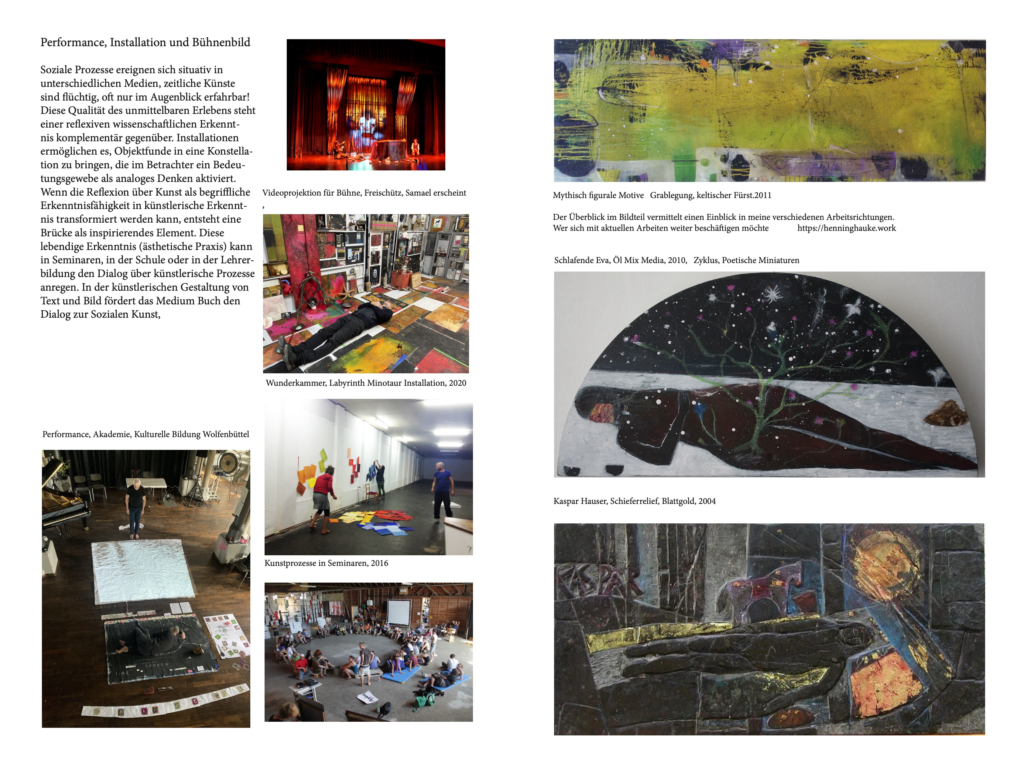 Kunst lässt sich in meiner Arbeit in sozialen Arbeitsfeldern kaum auf ein Medium beschränken. Zu vielfältig sind die Aufgabenstellungen, die eine konkrete Beteiligung von Menschen an künstlerischen Prozessen im Alltag erfordern. Charakteristisch erscheint in der Arbeit rückblickend eine Vielfalt von Ausdrucksformen im Ringen um geeignete Medien und Materialien. Vom mit Gold überzogenen Rosenblock aus dem Iran, über Glas in der Architektur, bis hin zum Film oder Buch als künstlerische Dokumentation pädagogischer Prozesse und der Rauminstallation im Bühnenbild sowie Abschlussprojekten von Seminaren erscheinen die Suchbewegungen heterogen, im Kern jedoch immer bezogen auf den Fluss des Lebens, der angesichts einer gesellschaftlichen Situation eine angemessene Resonanz aus und mit der Kunst zu schaffen versucht. In der Verschmelzung von Kunst und Pädagogik eröffnen sich unterschiedliche Felder künstlerischer Intervention, von der Kunstvermittlung als produktivem Handeln bis hin zu Performances in Galerien oder Seminaren, alles performative Felder, die das Lebendige der Kunst als Wirklichkeit erfahrbar machen. Performance, Installation und Bühnenbild. Soziale Prozesse ereignen sich situativ in unterschiedlichen Medien, zeitliche Künste sind flüchtig, oft nur im Augenblick erfahrbar! Diese Qualität des unmittelbaren Erlebens steht einer reflexiven wissenschaftlichen Erkenntnis komplementär gegenüber. Installationen ermöglichen es, Objektfunde in eine Konstellation zu bringen, die im Betrachter ein Bedeutungsgewebe als analoges Denken aktiviert. Wenn die Reflexion über Kunst als begriffliche Erkenntnisfähigkeit in künstlerische Erkenntnis transformiert werden kann, entsteht eine Brücke als inspirierendes Element. Diese lebendige Erkenntnis (ästhetische Praxis) kann in Seminaren, in der Schule oder in der Lehrerbildung den Dialog über künstlerische Prozesse anregen. In der künstlerischen Gestaltung von Text und Bild fördert das Medium Buch den Dialog zur Sozialen Kunst,